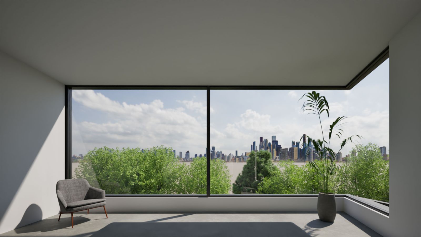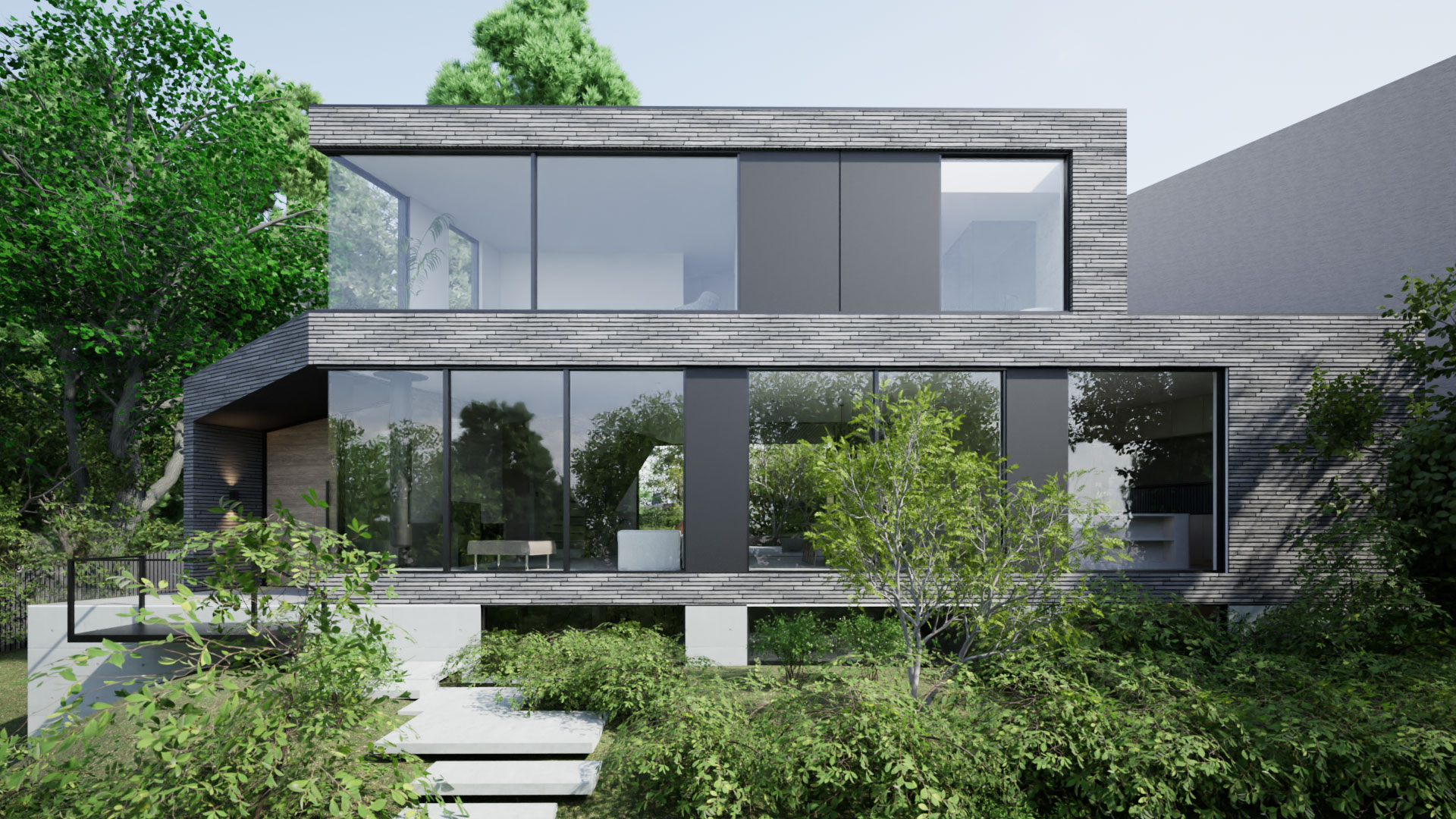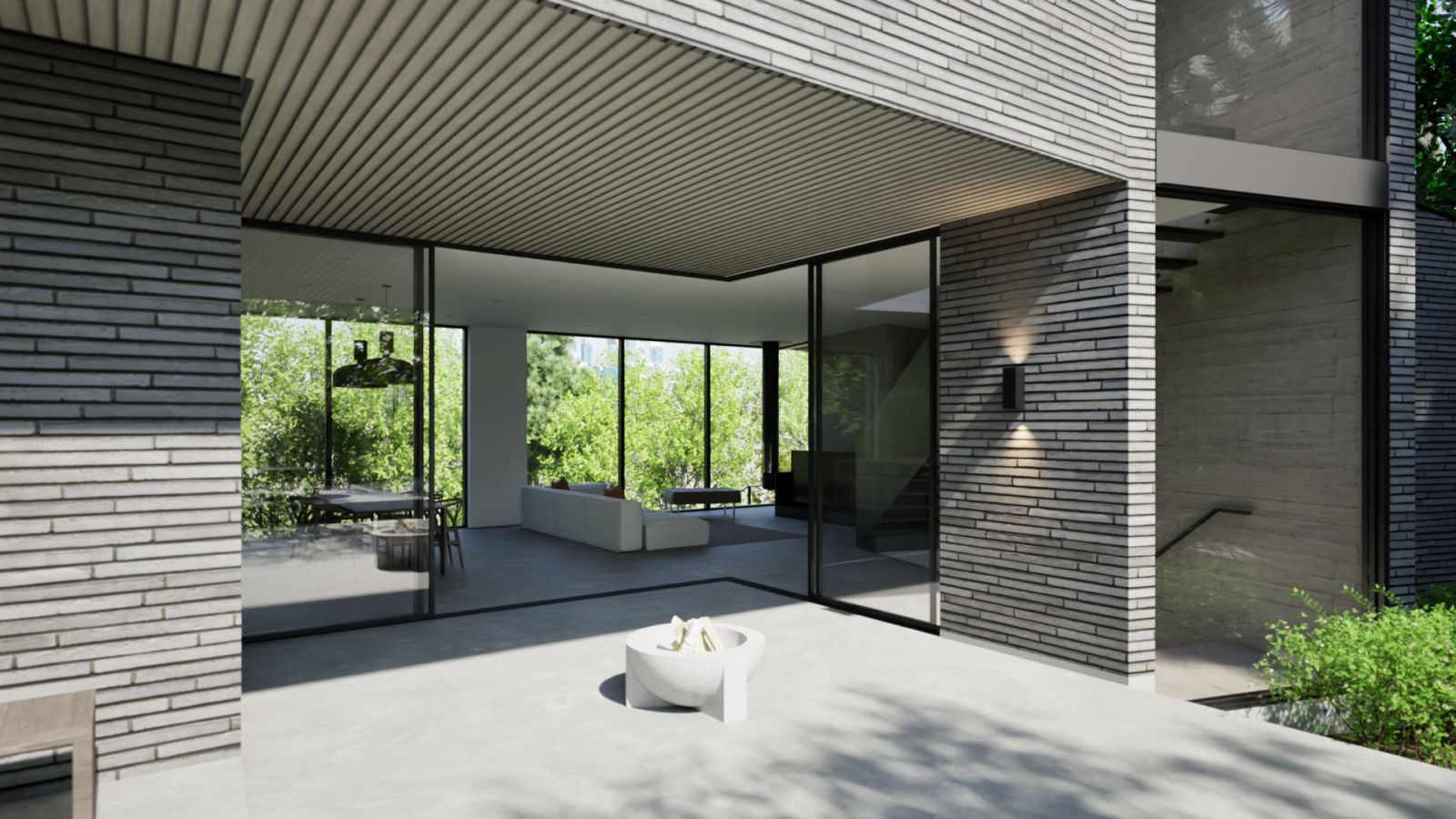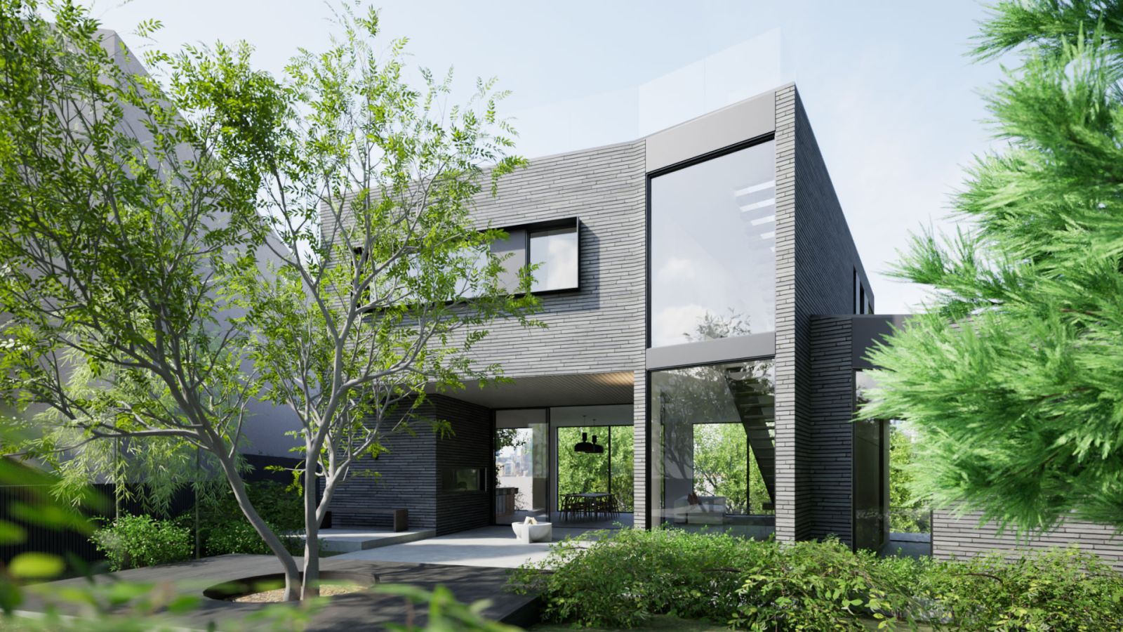 This rear exterior rendering showcases the clean geometry of linear brick, custom thin-profile metal detailing, expansive glazing, and skylights that flood the interior with natural light.