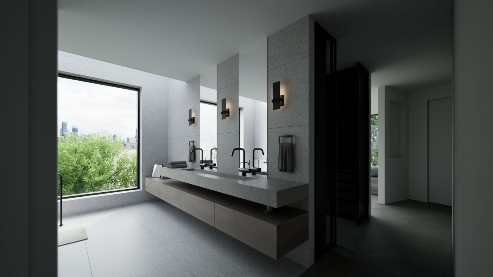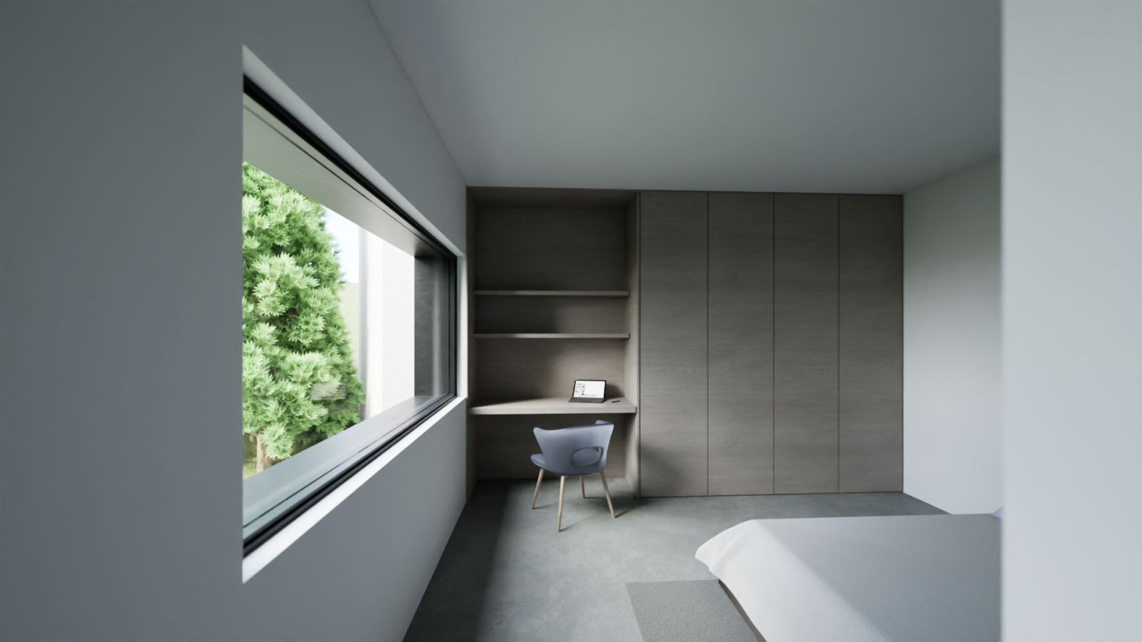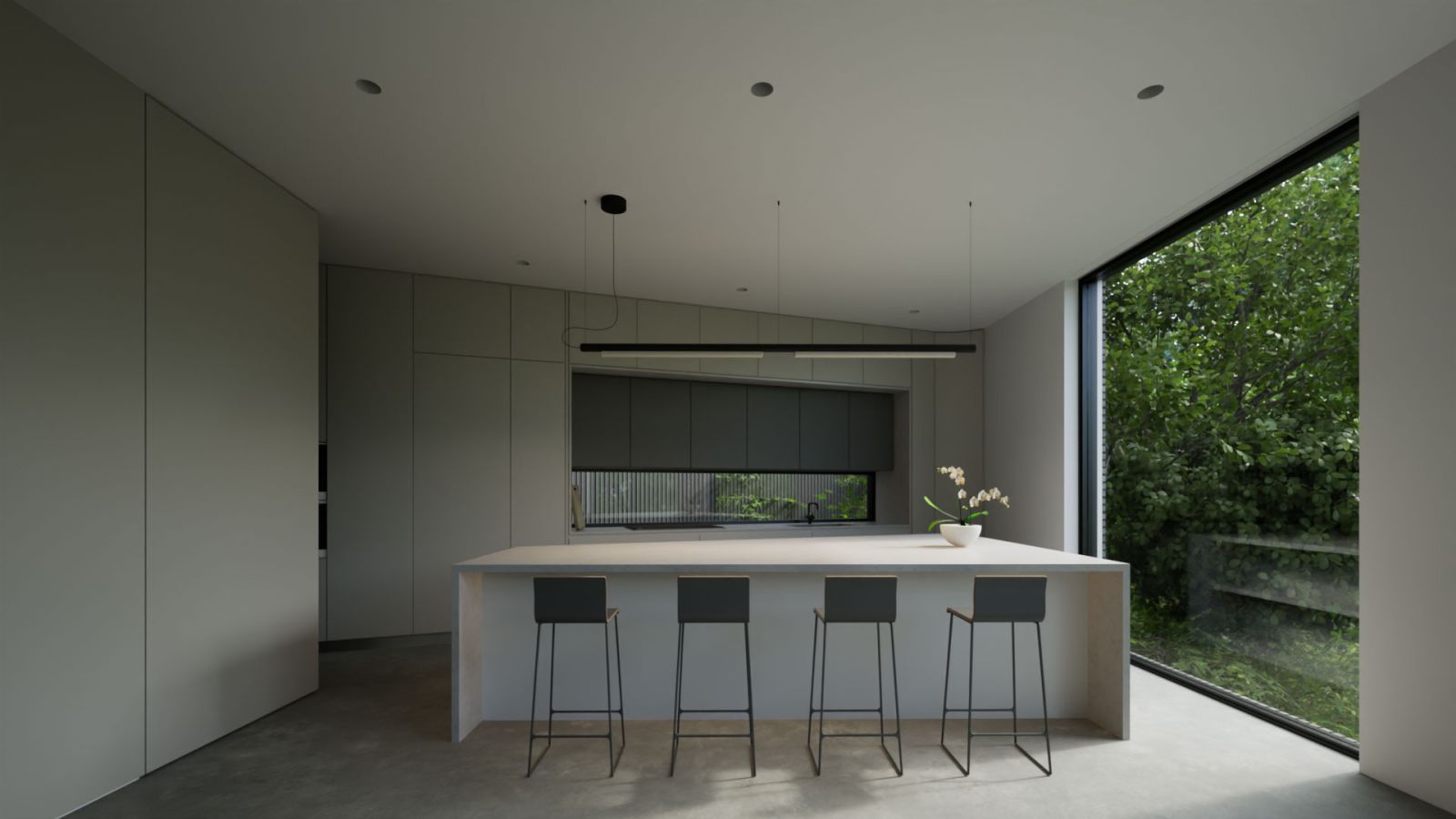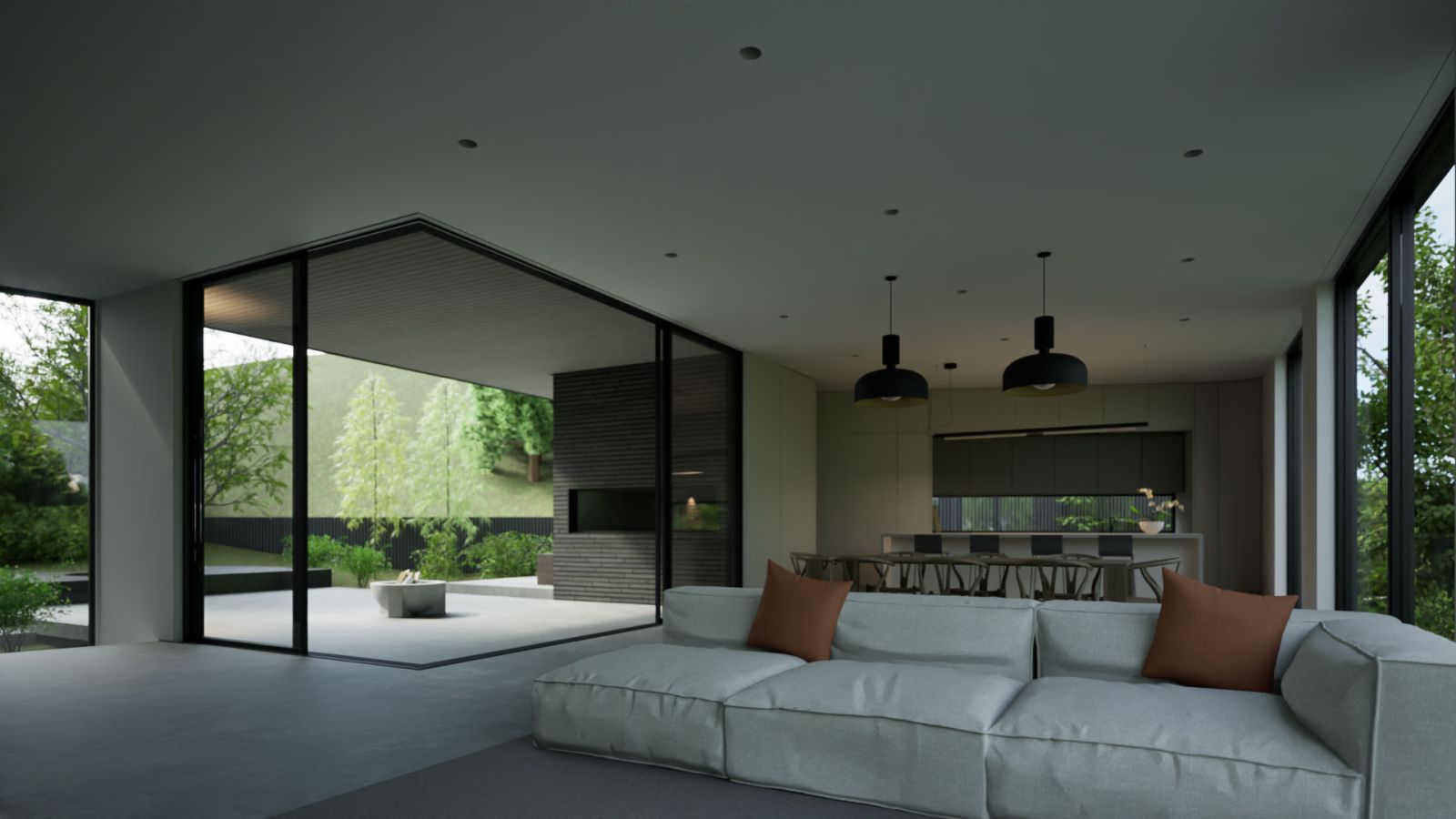 This rear exterior rendering showcases the clean geometry of linear brick, custom thin-profile metal detailing, expansive glazing, and skylights that flood the interior with natural light.