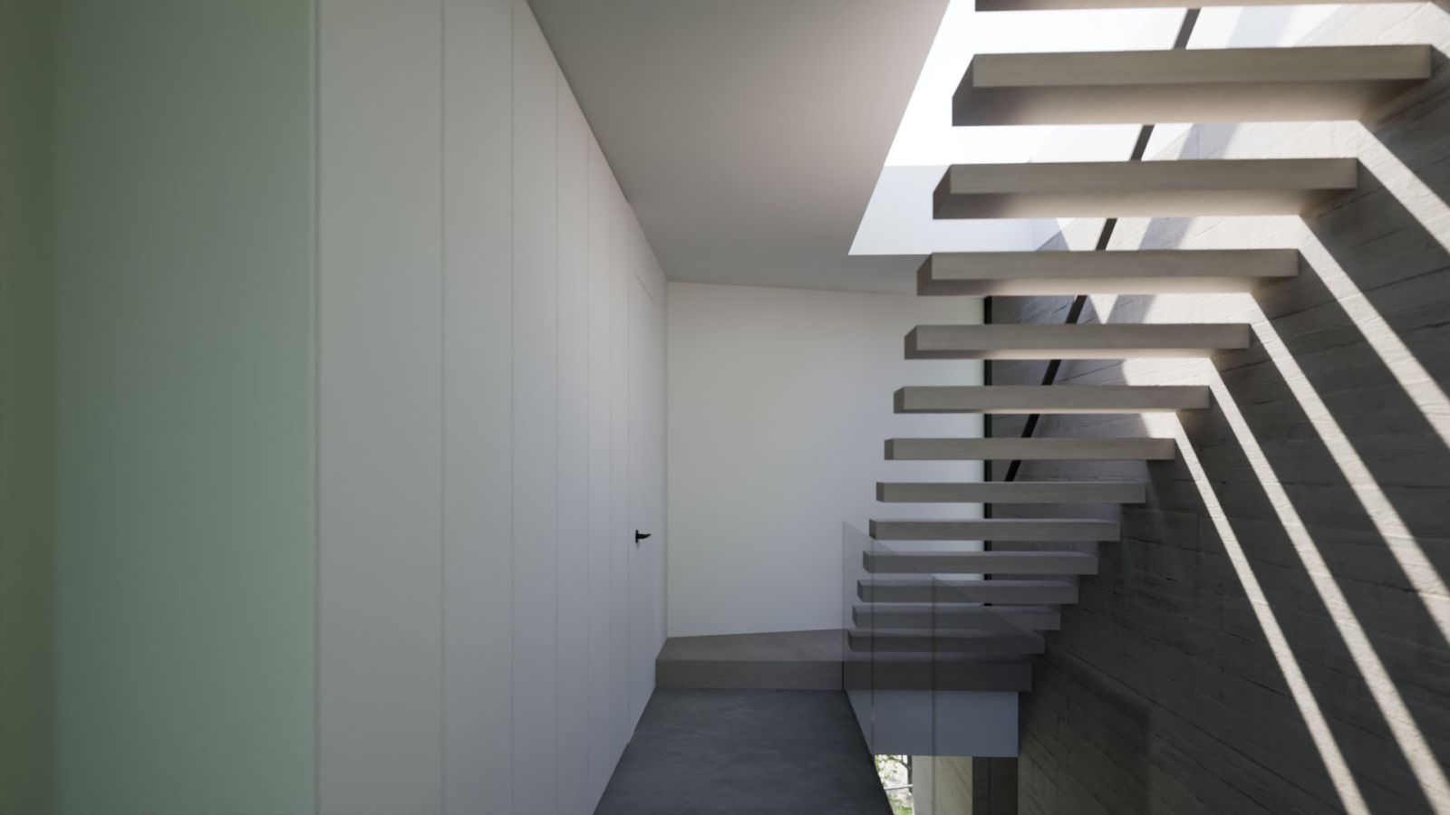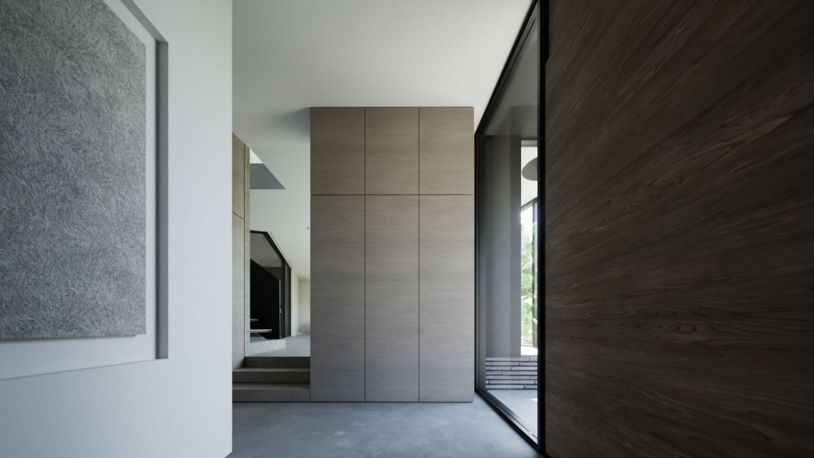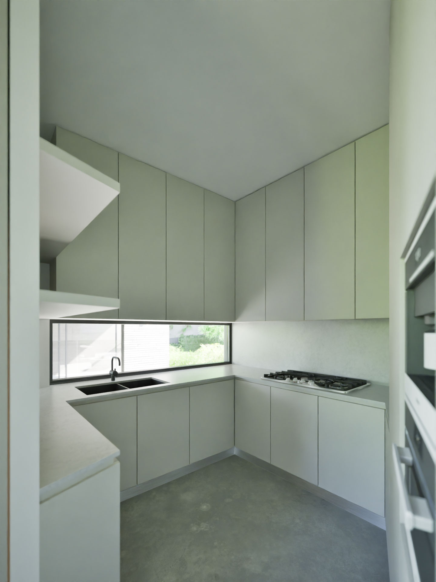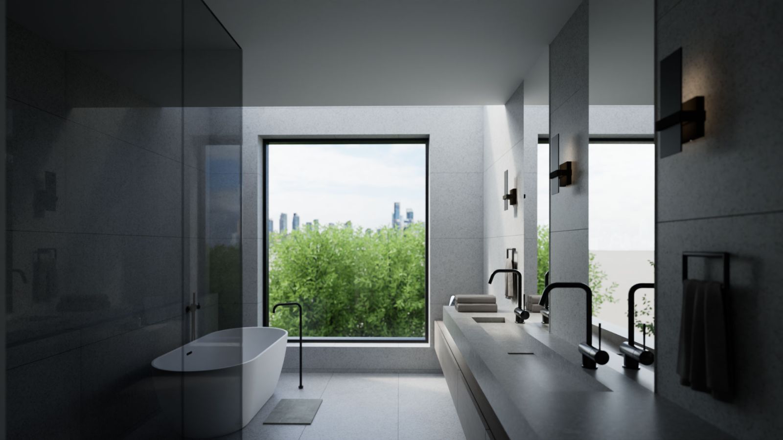 This rear exterior rendering showcases the clean geometry of linear brick, custom thin-profile metal detailing, expansive glazing, and skylights that flood the interior with natural light.