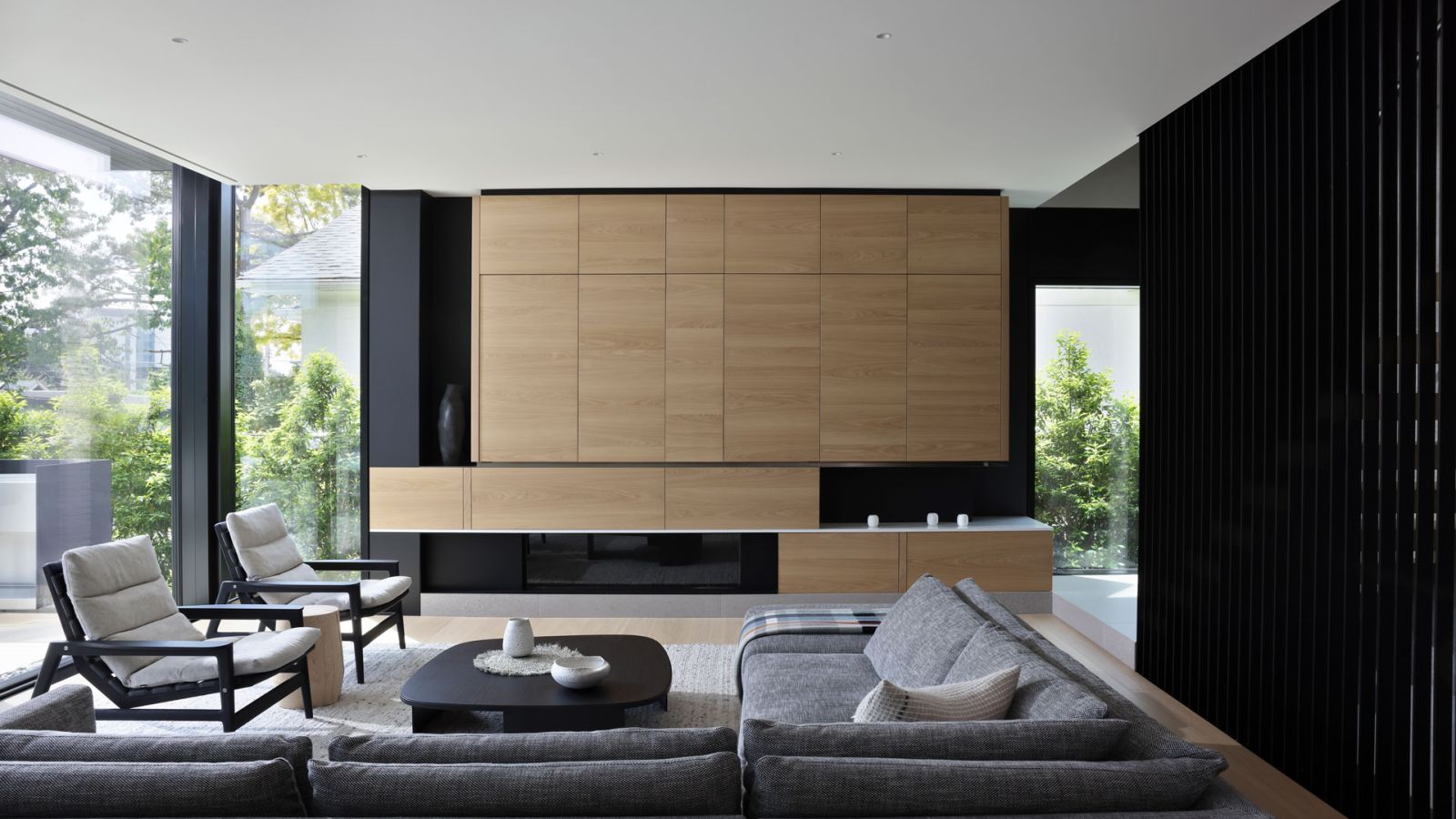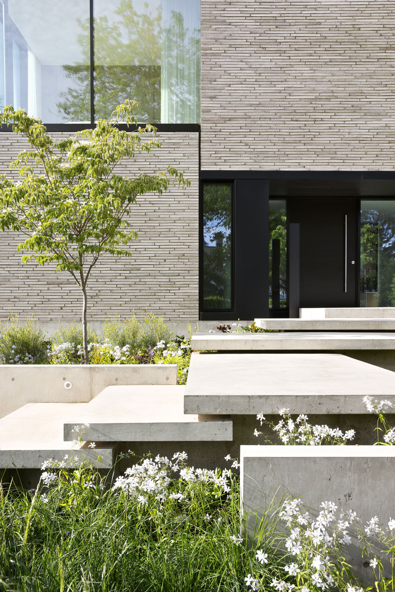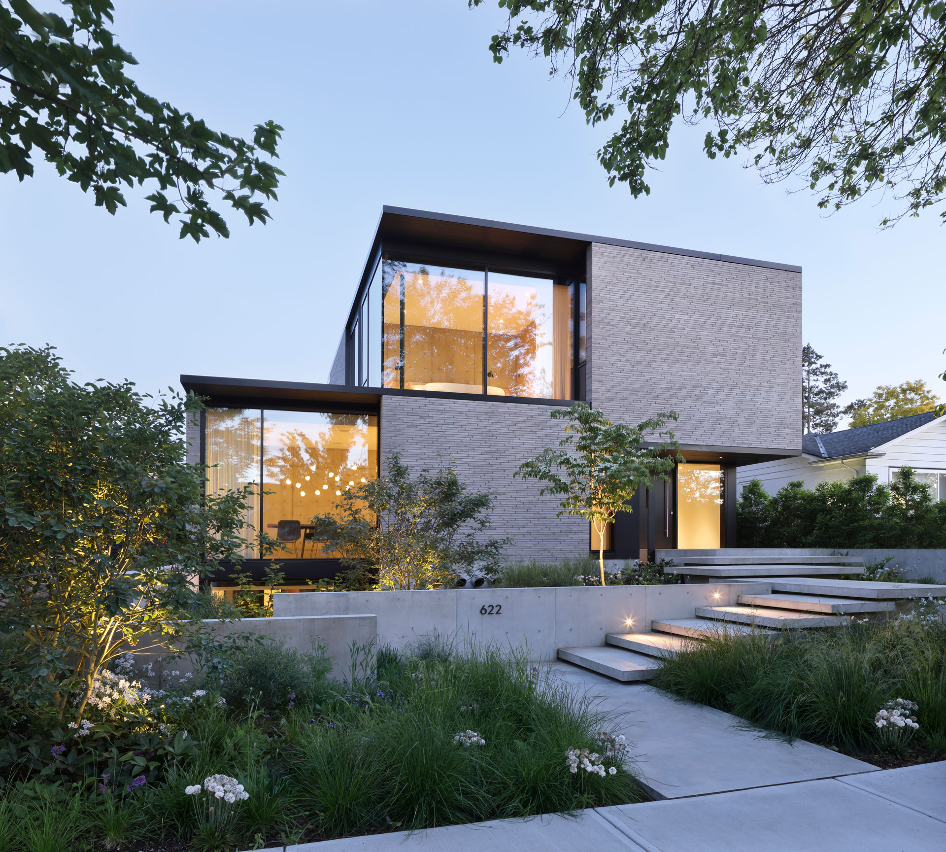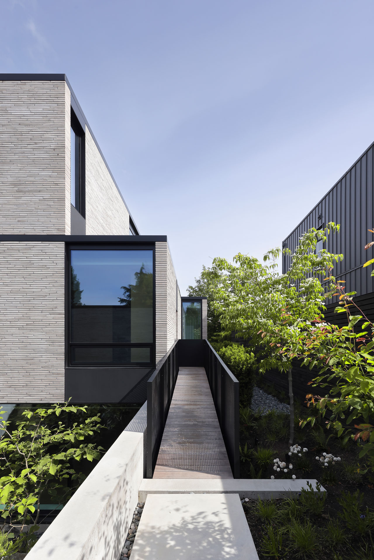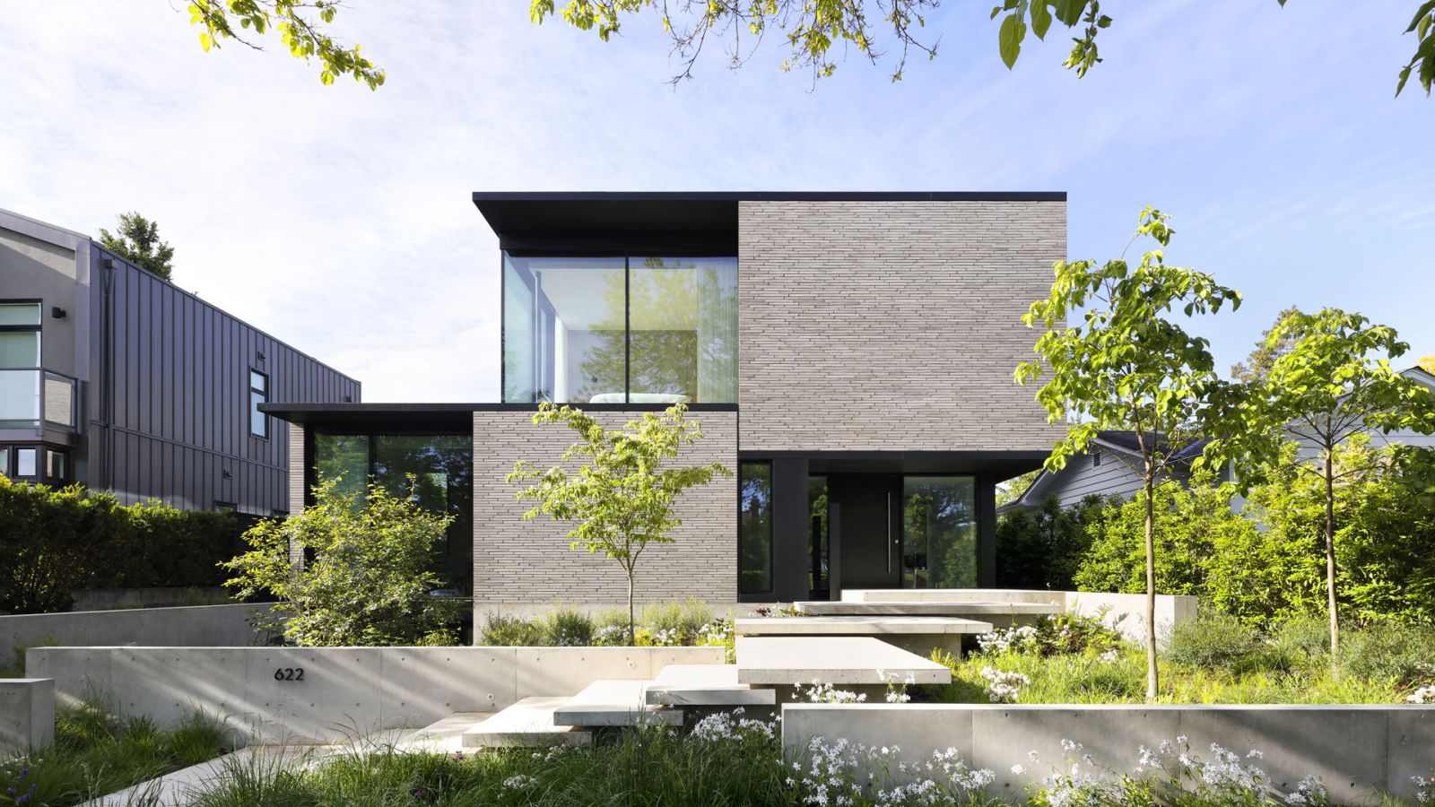 This exciting house features razor roof lines, Italian linear brick and warm wood accents. A masterful composition with intelligent detailing and relationships to the landscape.